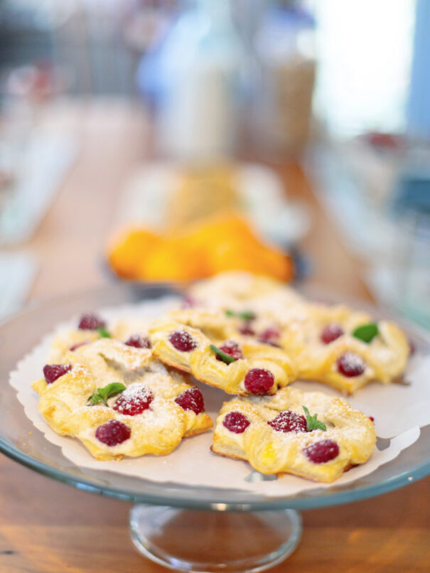 Fluffy scrambled eggs, melty cheese, and other savory fillings are wrapped in delicate puff pastry, then baked to golden, flaky perfection. A warm, comforting start to the day. Vegetarian option available.